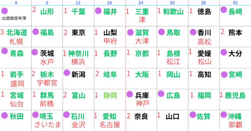 都道府県を総務省の自治体コード順に置いたマトリクス。紫の丸はこれまでの試験であまり触れられていない地域。緑色は後述する白地図の準備ができた地域。(2026年2月15日現在)
