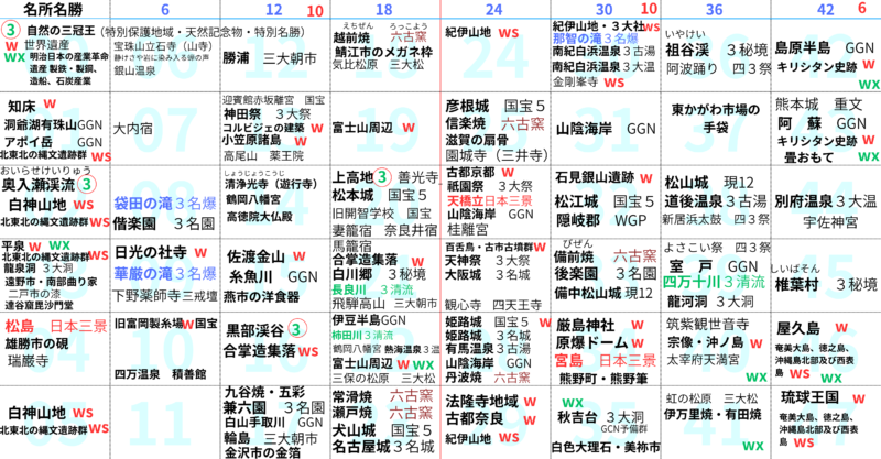 まずは、日本地理に頻出する最重要事項をこの48マスのマトリクスにざっとマッピングし、「セルの位置・都道府県・内容」をセットで覚えていきました。