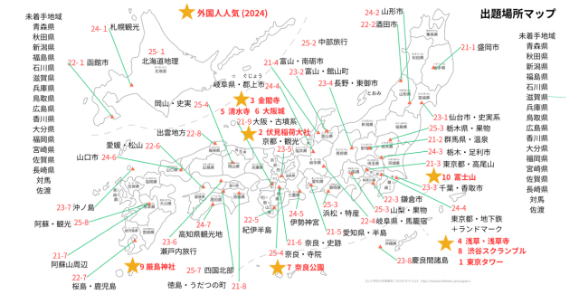 今回のアイキャッチ画像は、2025年の秋、私自身が編纂した「日本地理の出題履歴と訪日外国人が選ぶ観光地ベストテン」を日本の白地図にプロットしたものです。当初、こうしたマッピング形式で情報を頭に入れようと試みたのですが、これは想像以上にハードルの高い勉強法でした。地図を作ってはみたものの、二度三度と眺めたところで、なかなか頭の中で整理しきれなかったのです。